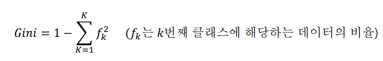 - 두 클래스가 반반씩 속한다면 지니계수는 1 - (0.5 * 0.5 + 0.5 * 0.5) = 0.5