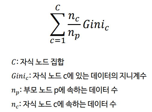 - 분할한 결과로 만들어진 자식 노드들 각각에 대해서 지니 계수를 구하고 가중평균하여 분할 결과를 측정.