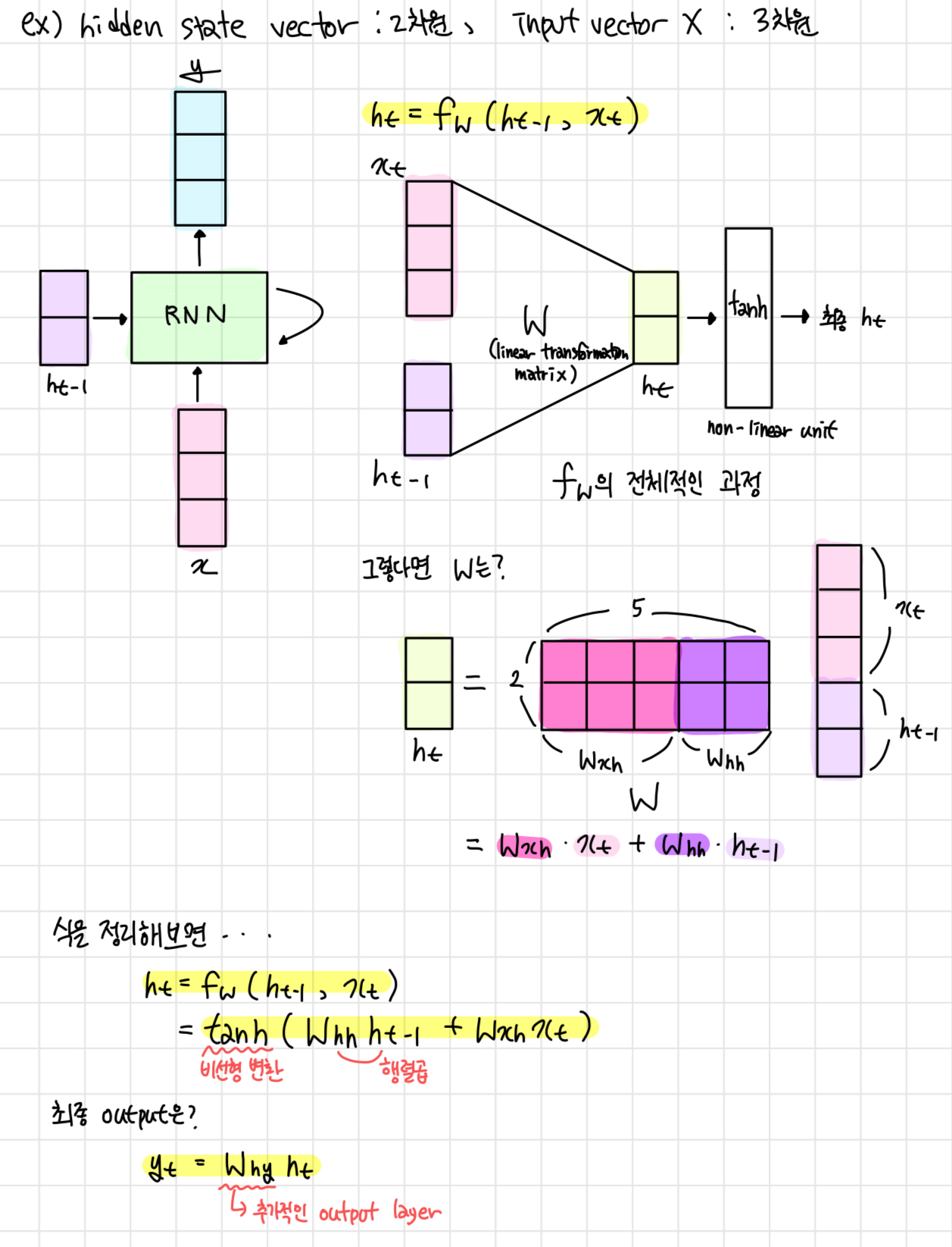 - 이 때, W와 입력값(x_t, h_(t-1))으로 tan_h를 곱해서 h_t를 구해준다.